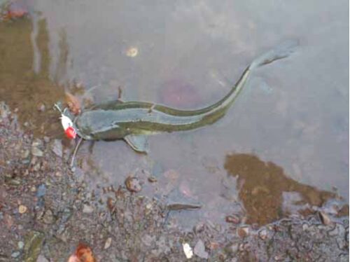 8/6(土曜)中潮:晴れ 朝から立岡池へ行きトップを投げる。ベビートーピードを引いているとナマズが連発。計2匹釣れた