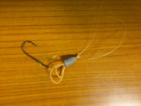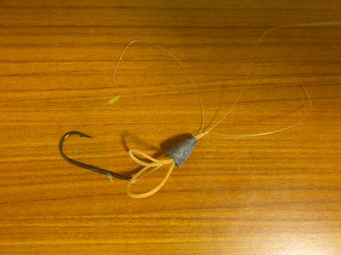 穴にビニール管が通してある高級タイプのシンカーだと逆にこの方法は使えない。※輪ゴムが穴に通らない為