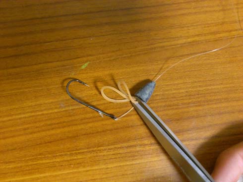 穴に通すための釣り糸を前もって切っておく。釣り糸を輪ゴムに潜らせて釣り糸二本をシンカーの穴に通す。