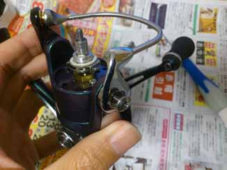 ベイルアームの取り付け。ネジは奥と前(ラインローラーネジ)で交互に締めていくと良い