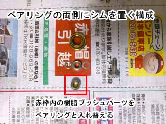 樹脂ブッシュと脱脂洗浄したベアリング(シムで両側を挟む形)を交換。赤枠内の樹脂ブッシュパーツは必要ない