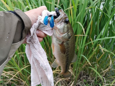 テキサスリグで釣れるが型があんまり良くない。この辺で大粒の雨が降り出す