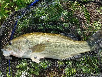 バス釣れないんで移動。ー中略― カエルを入れるとバスがヒット。大体45cm